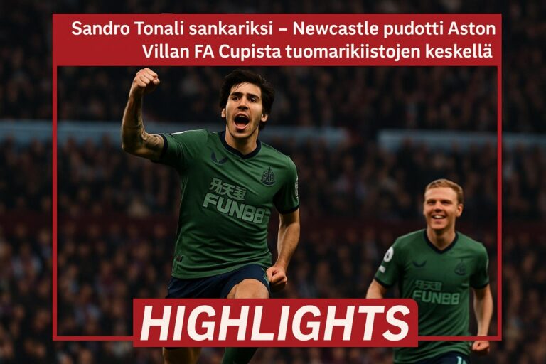 Sandro Tonali teki kaksi maalia, kun Newcastle United voitti Aston Villan 3–1 ja eteni FA Cupissa. Ottelua sävyttivät kiistanalaiset tuomaripäätökset ja Aston Villan punainen kortti.