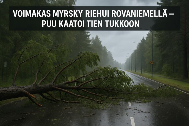 Rovaniemellä riehunut myrsky kaatoi suuren puun keskelle tietä, mikä pakotti autoilijat käyttämään kiertoteitä. Lue lisää myrskyn vaikutuksista.